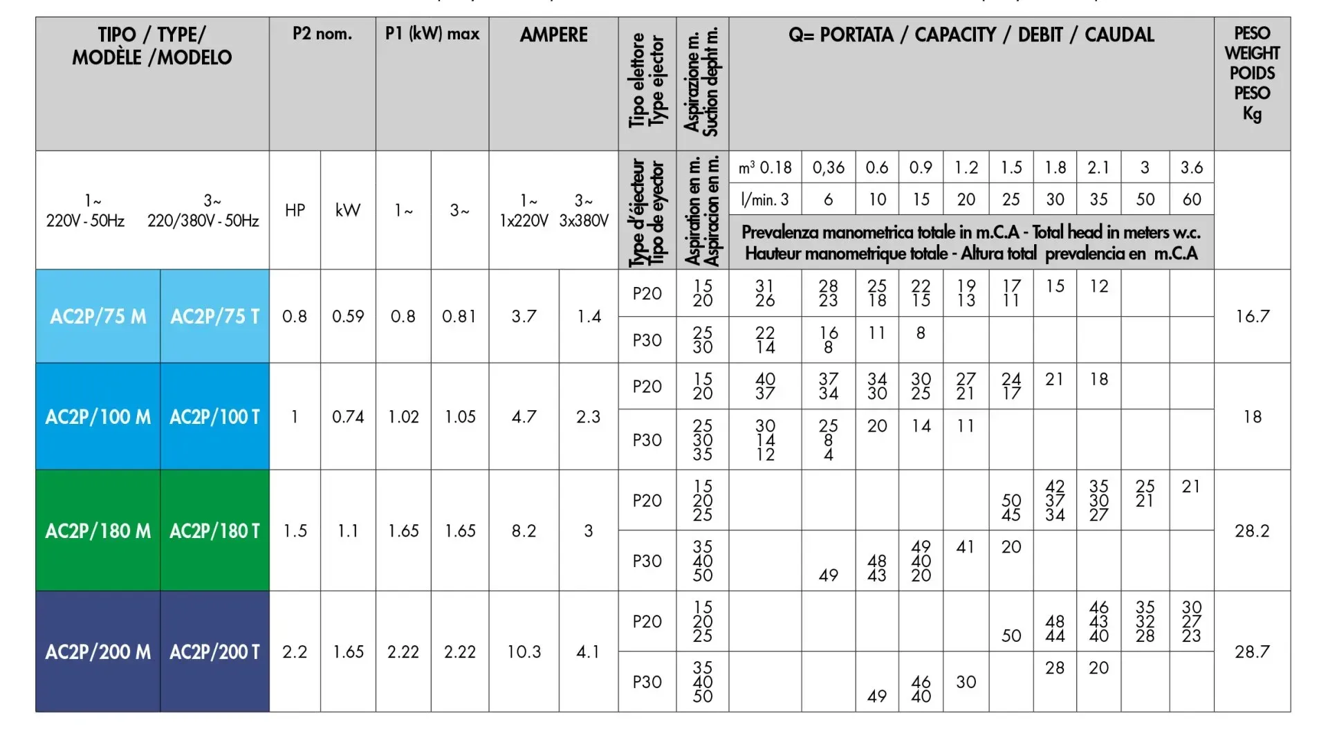 - Supporto motore in alluminio o ghisa per modelli AC2 P75/100, in ghisa per modelli superiori;